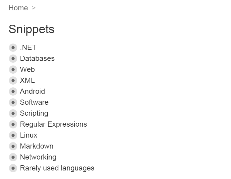 So back to code snippets. Each node in Workflowy can have a text-based note attached to it. So I use this to store my snippet for that item. Then I use the the bullet point hierarchy to structure my snippets - first breaking them down into language, then category, then description of the snippet. Then I attach the snippet as a note to that description. It's probably easier to explain with a screenshot ...