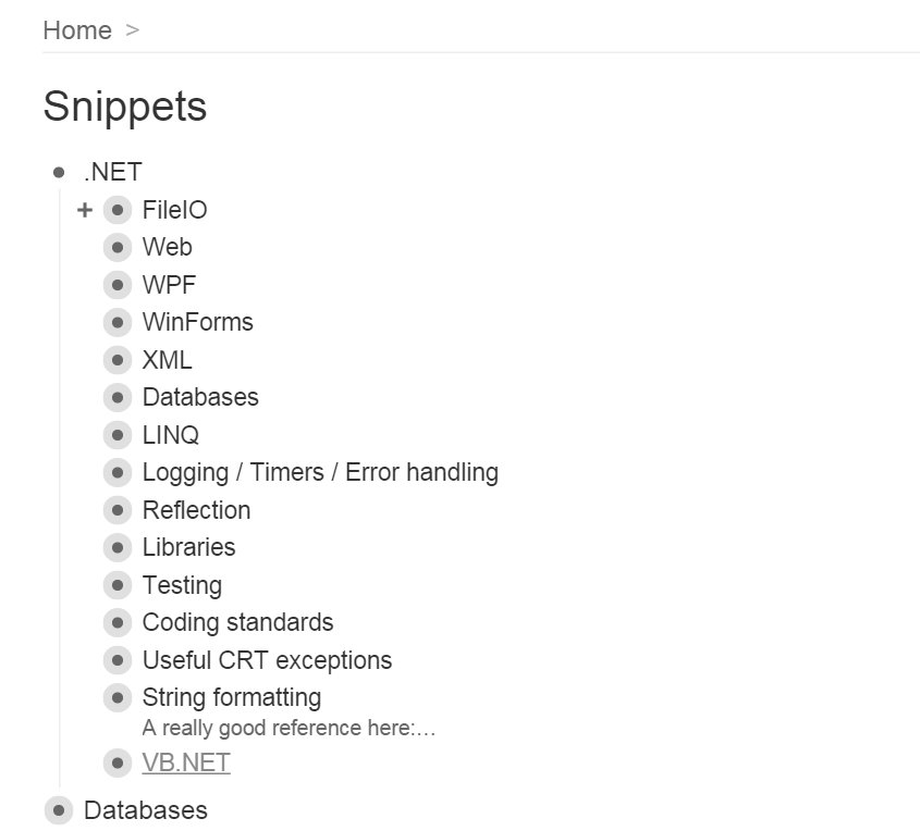 The above screenshot is my snippets node with all the sections collapsed. I can either click on a plus (which appears on mouse-over) to expand that node; or I can click on the bullet point itself to zoom in...