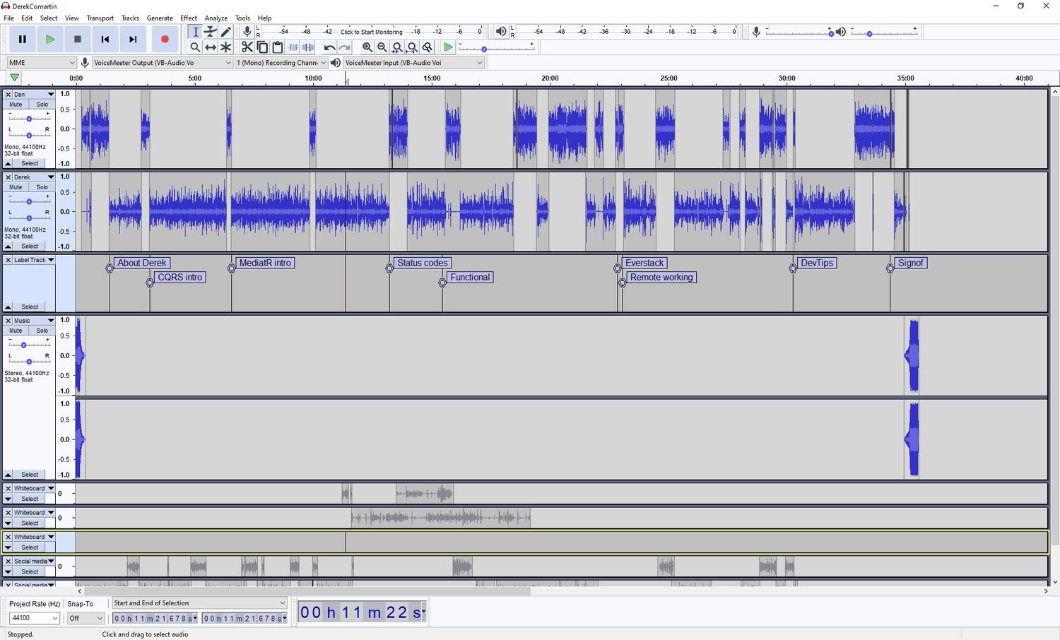 Another part of all this is the audio editing. This is actually something I'm quite enjoying. So far I've been using Audacity, which is a fantastic open-source cross-platform application. It's super-easy to modify multiple tracks, chop out bits, and move stuff around. I'm finding it amazing how easy it is to tidy up audio without being able to tell when listening back. Eg. removing erms, and ums, pauses, etc. Also because each speaker's audio is recorded to a separate channel, it's easy to clean up cross-talk where both speakers start to talk at the same time, and make it sound seamless. Once used to using Audacity, especially if you learn a few of the keyboard shortcuts - it becomes very efficient to do this editing.