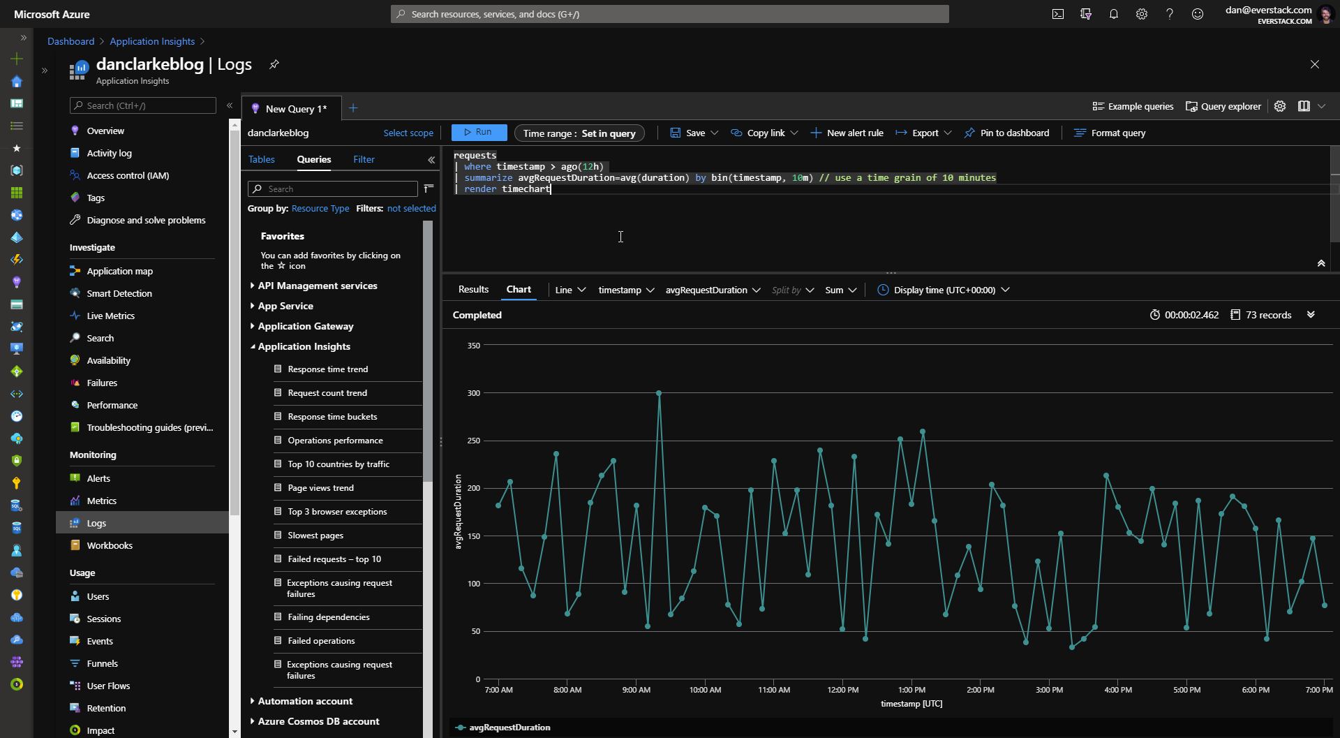Notice the query panel in that screenshot with a SQL-like query? This is insanely powerful, and the intuitive intellisense make it even easier to write queries against your logs. You can dump out tables of trace log data, or render charts as in the above screenshot. These charts can easily be pinned to your dashboards (see below).